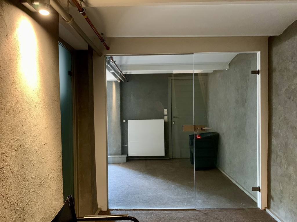 Het kantoor is opgedeeld in ruimtes op het gelijkvloers en de kelderverdieping, deze hebben hoge plafonds en zijn zeer lichtrijk. Op het gelijkvloers bevinden zich 2 bureaus, een kitchenette/opslagruimte en afzonderlijk toilet. Verder is er nog toegang tot het gemeenschappelijke koertje, te delen met de bewoners boven het kantoor. In de kelderverdieping bevinden zich nog 2 bureaus en een opslagruimte/technische ruimte.
