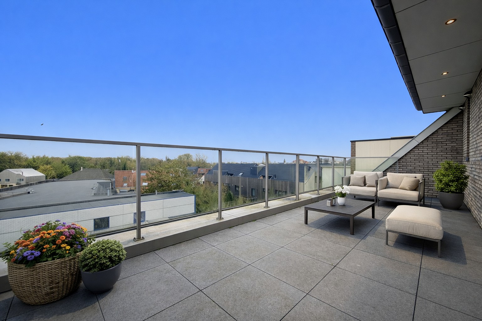 Een belangrijke troef zijn de twee ruime terrassen, elk 21,60 m² groot. Het achterterras biedt zicht op de Leie, terwijl het voorterras zorgt voor extra buitenruimte en zon op verschillende momenten van de dag.