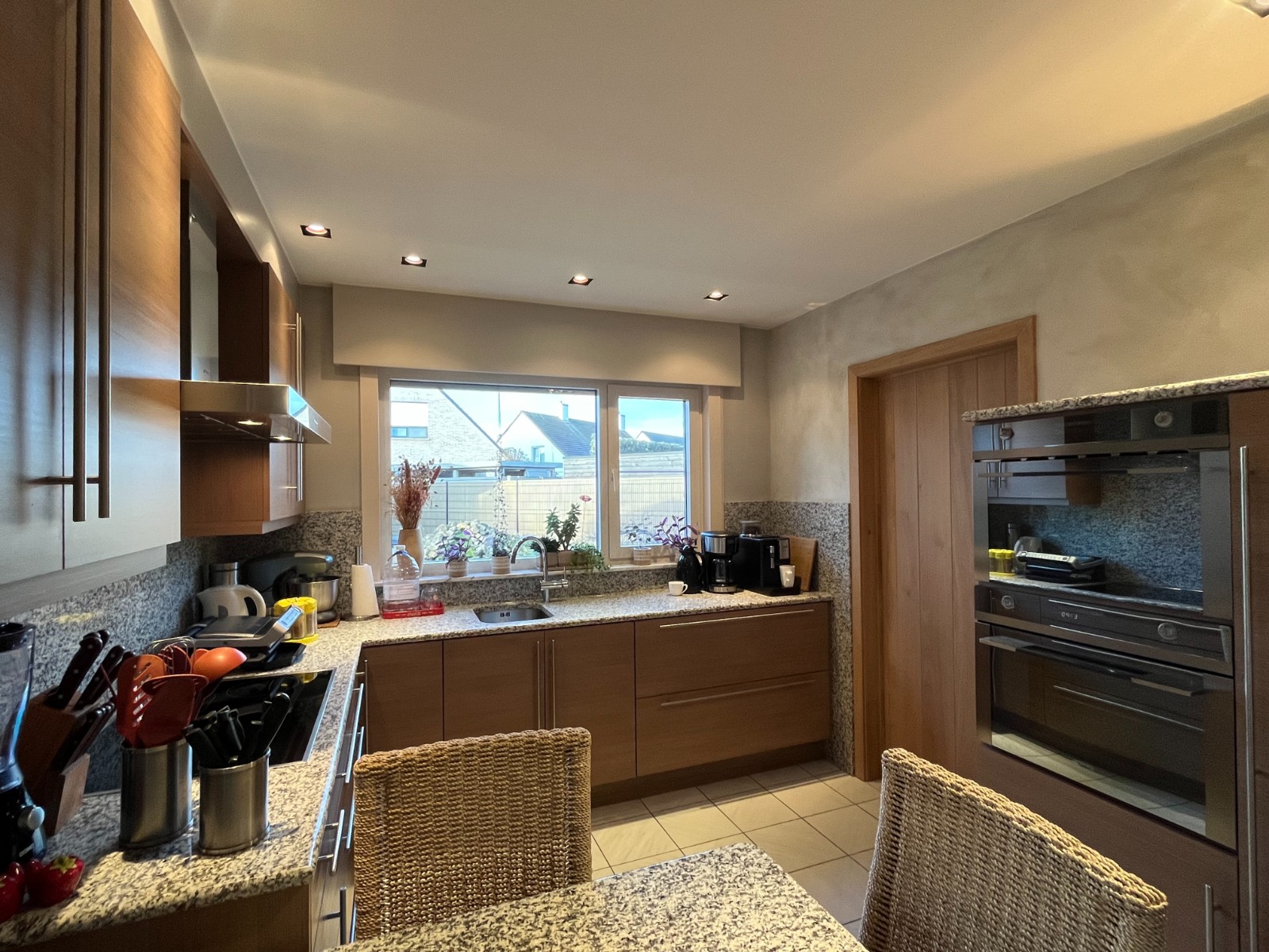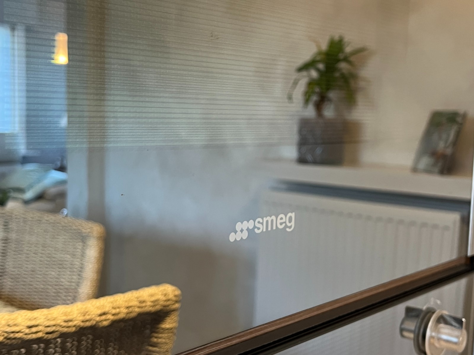 De volledig uitgeruste keuken is een echte blikvanger en beschikt over kwalitatieve SMEG-toestellen: keramische kookplaat, koelkast, oven en microgolfoven. Het marmeren werkblad zorgt voor een luxueuze uitstraling. Vanuit de keuken heb je bovendien rechtstreekse toegang tot de garage met elektrische poort.