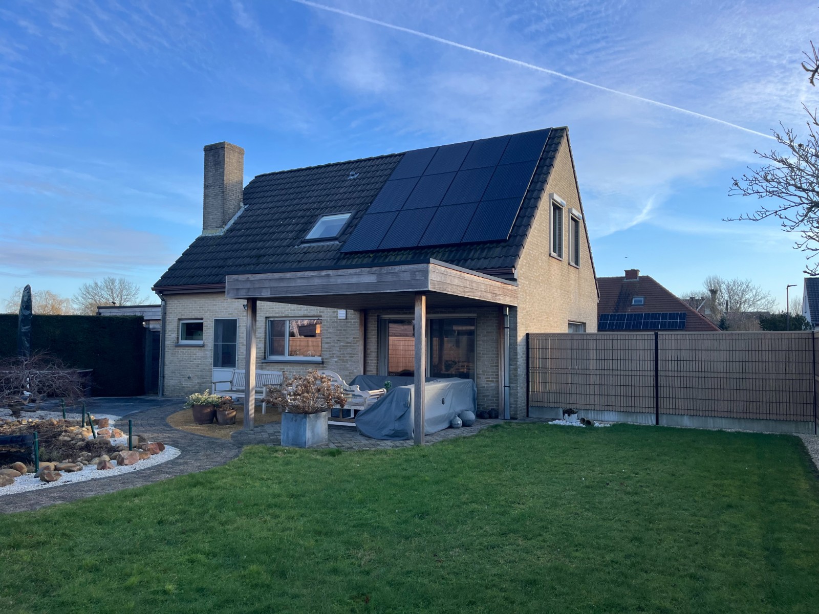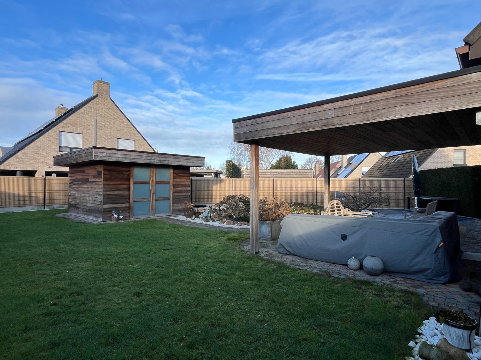 De tuin is volledig omheind met een nieuwe, privacyvolle afsluiting waar je niet kan doorheen kijken. Hier geniet je in alle rust van het terras met overkapping en het tuinhuis, beiden uitgevoerd in duurzaam padouk hout. Een vijver en een klinkerterras maken het plaatje compleet.